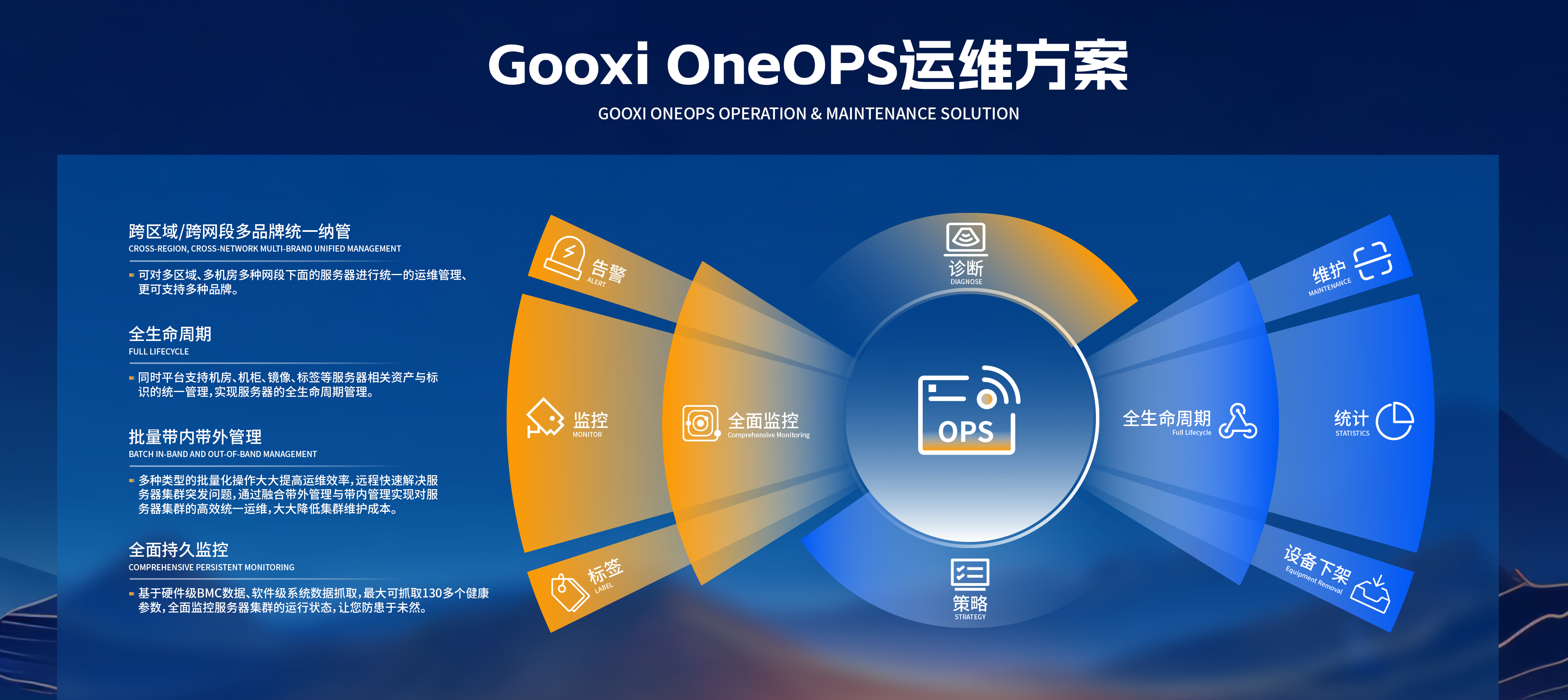 One OPS平台是Gooxi自主研发的针对服务器集群的⼀体化运维管理平台,是企业级数据中心或智算中心运维管理的解决方案。它顺利获得标准化、自动化、数据化的方式实现多种多样的运维功能,大大提升运维效率,降低运营成本,提高业务可用性。可以实现跨区域、跨网段多品牌统一纳管,同时平台支持机房、机柜、镜像、标签等服务器相关资产与标识的统一管理,实现服务器的全生命周期管理。多种类型的批量化操作大大提高运维效率,远程快速解决服务器集群突发问题,顺利获得融合带外管理与带内管理实现对服务器集群的高效统一运维,大大降低集群维护成本。基于硬件级BMC数据、软件级系统数据抓取,最大可抓取130多个健康参数,全面监控服务器集群的运行状态,防患于未然。