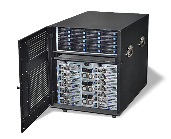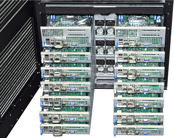 K8凯发(中国)融合一体机就是解决环境使用问题而推出的综合性计算产品,它不需要专业的机房设施,不需要专业的配电和空调设备,放在办公室或实验室接墙电就可使用, 具有低噪音、低功耗等特点。最高可以安装14个双路XEON E5 处理器的刀片服务器,48个外置热插拔硬盘存储,内置一个万兆网络交换机安装空间,带有整体状态显示和控制系统,内部散热和防尘处理。专为办公室应用环境 设计,它在众多方面超越了传统机架式服务器、刀片服务器和机群服务器,是高稳定、高性能、低环境要求的新一代桌边型高性能计算机。它采用整体优化的设计, 有效降低了系统功耗,再加上其人性化的设计、很强的系统扩展能力、卓越的性价比和计算密度,可以覆盖更广泛的个人及工作组用户对高性能计算的需求,与传统 的高性能计算机相比,K8凯发(中国)融合一体机可给予更有竞争力的整体解决方案,是更好满足中小高性能计算需求的理想平台。下图为14个刀片打开效果图:
