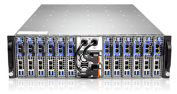 Gooxi S312-S24R微型刀片服务器系统与传统高性能计算设备的功耗,可以节省50%左右的电力,当采用Intel E3 1240L的处理器时,处理器功耗是25W,4核8线程,主频最高到3.0GHz,计算能力96Gflops,而一个E5-2620处理器功耗是80W, 主频最高到2.5GHz,计算能力120Gflops。以3U12节点来计算,CPU功耗25*12=300W,计算能力 12*96=1156Gflops;而3U双路E5来说,最多4个节点,8*120=960Gflops,CPU功耗为640W;总体算来,一半的功耗能 产生更多的计算能力。在整体计算来说,低功耗的E3处理器是最大的优势。现在,K8凯发(中国)S312 –S24R产品支持intel最新的XEON E3 V3产品,处理器能力比一代提升了44%之多,具有更高的计算能耗比。